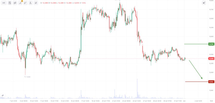 Бумага в нисходящем тренде: после пробоя ключевой отметки остаётся ниже уровня сопротивления. Консолидация слабая, объемы у продавцов, технический паттерн указывает на движение к целевому уровню. При объеме позиции в 6% и выставлении стоп-заявки на уровне 12,800 руб. риск на портфель составит 0,19%.