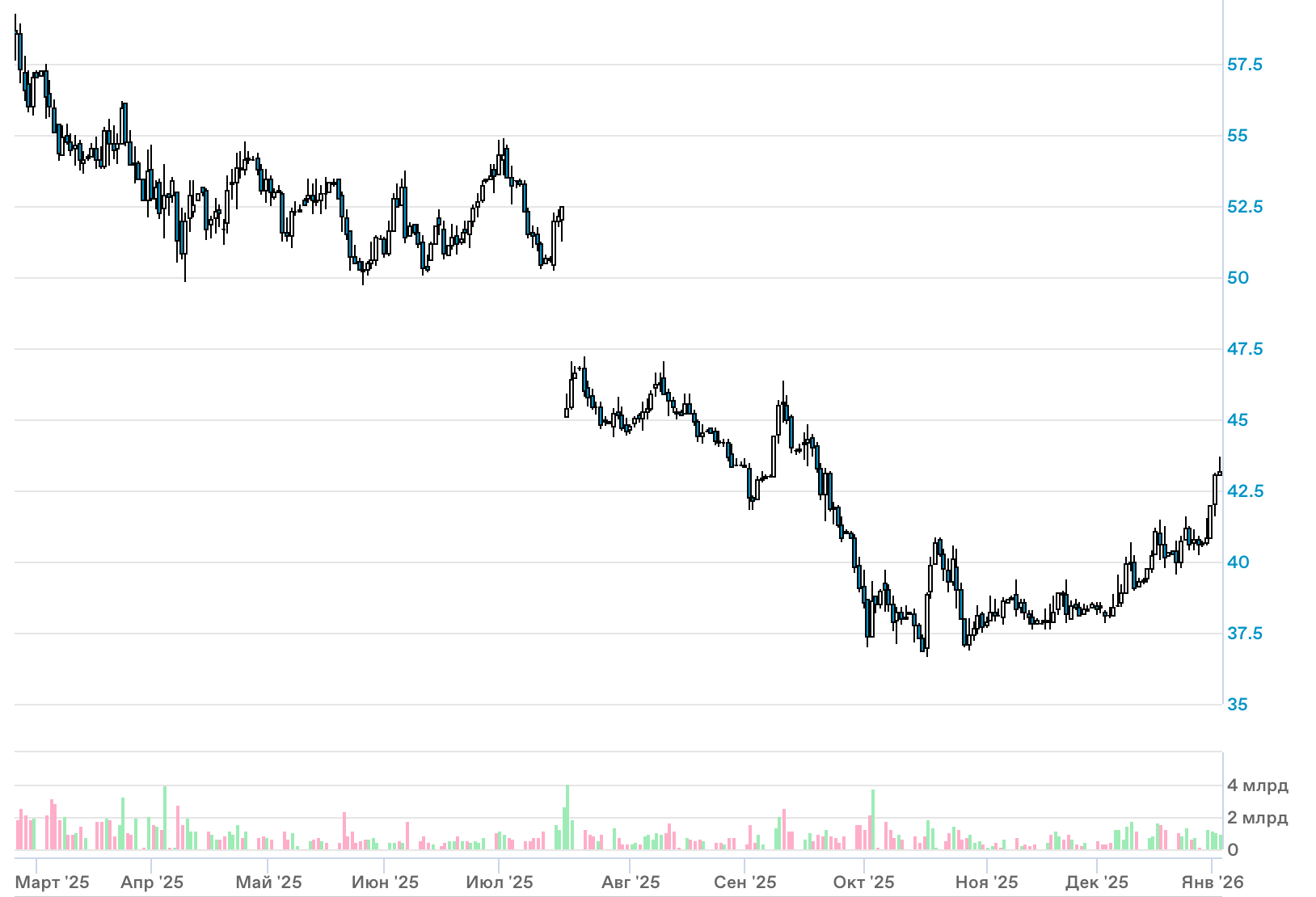 Высокая чувствительность к девальвации. Даже при умеренном ослаблении рубля и закрытии 2026 года вблизи 85 руб. дивиденд может составить около 7 руб. на акцию, что соответствует доходности 16,5% к текущей цене. При более слабом рубле дивиденд и потенциальная доходность будут расти.