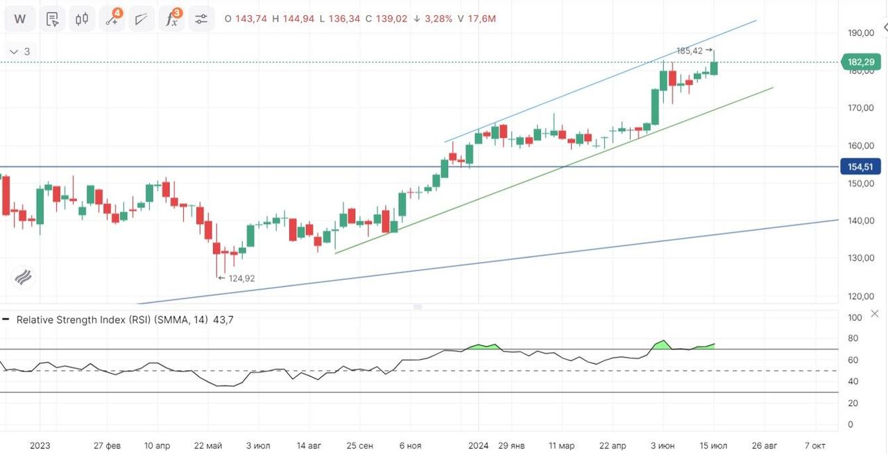 Акции двигаются в рамках восходящего канала. Возможно снижение к нижней границе канала (район $ 170). При пробитии этой границы вероятно снижение до уровня поддержки $ 154,5. Поддержка в виде глобального тренда будет находиться как раз на уровне $ 140.
