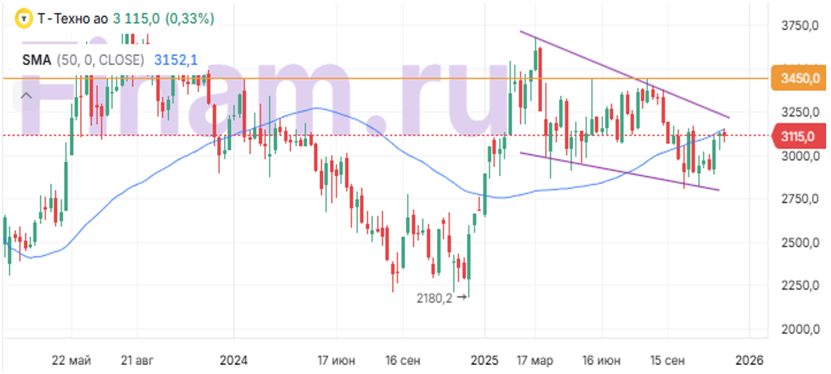 С точки зрения технического анализа на недельном графике акции «Т-Технологий» оттолкнулись от нижней границы среднесрочного нисходящего клина, однако по пути к верхней границе встретили сопротивление в виде 50-недельной скользящей средней. Стоит дождаться выхода из фигуры наверх, после чего станет целесообразным открытие среднесрочных длинных позиций в расчете на продолжение роста с первой целью на отметке 3 450 руб.