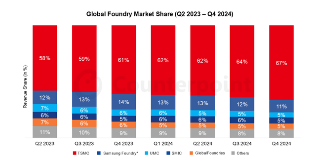 Доля мирового рынка литейного производства в квартальном исчислении до 2024 г. (Counterpoint Research)