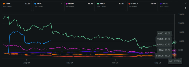 По сравнению с Samsung, компания торгуется с более высоким P/E, однако Samsung более диверсифицирован по другим сегментам, а также по снижающемуся сегменту литейного производства (теряя долю рынка, как показано выше на графике). Его клиенты, которые сильно зависят от Taiwan Semiconductor, все торгуются с премией по сравнению с ним, поскольку более последовательные темпы роста могут привести к более высокому P/E для Taiwan Semiconductor. Медиана сектора составляет 27,88, а Taiwan Semiconductor — 23,52, компания по-прежнему считается недооцененной, и у нее огромный потенциал прорыва к историческим максимумам.