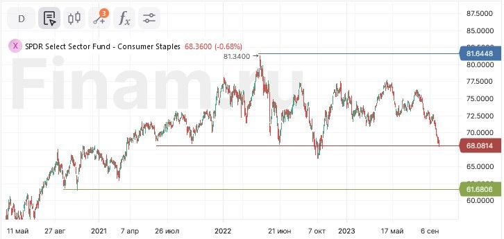 Акции потребительского сектора показывают отстающую динамику относительно широкого рынка. С начала года XLP подрос на 1,8%, в то время как S&P 500 увеличился на 9,6%. На горизонте 12 месяцев XLP снизился на 2%, широкий рынок вырос на 26,5%.