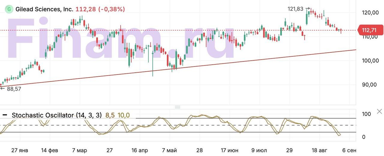 На дневном графике Gilead Sciences в силе среднесрочный восходящий тренд, который не показывает признаков скорого разворота, потенциал роста в обозримой перспективе сохраняется.