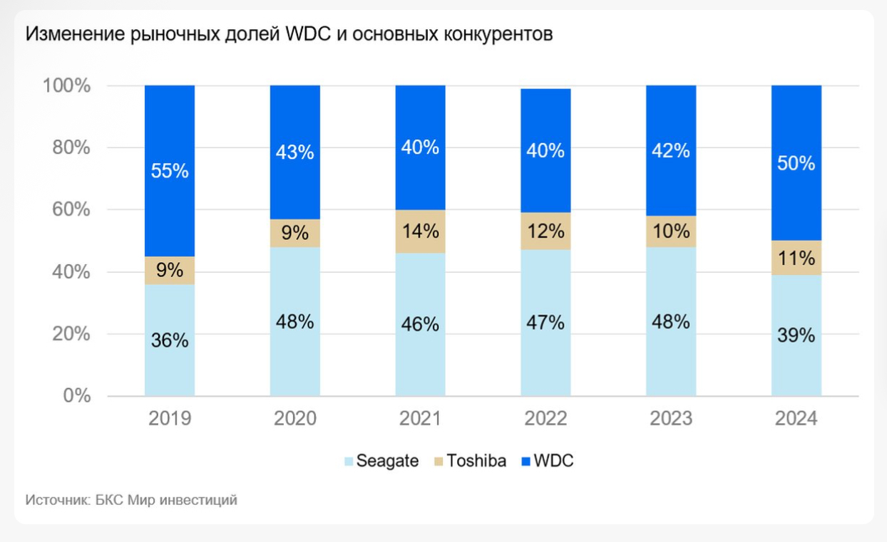 Рынок жестких дисков характеризуется высокими барьерами входа из-за значительных капитальных затрат, технологических сложностей и проблем с цепочками поставок, что привело к олигополии крупных игроков — Seagate, WDC. В настоящий момент WDC наращивает рыночную долю и лидирует на рынке HDD в силу технологического преимущества своей продукции. Как отметил CEO компании, поставки новейших продуктов ePMR, предлагающих емкости до 26 терабайт CMR и 32 терабайт UltraSMR, продолжают расти впечатляющими темпами, в I квартале было продано более 2,2 млн единиц.