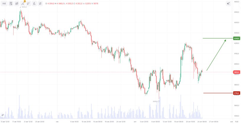 Начинается формирование локального восходящего импульса: цена пробила среднесрочную нисходящую трендовую линию и удерживается над сильной поддержкой 3850 руб., от которой уже произошел отскок. При объеме позиции в 6% и выставлении стоп-заявки на уровне 3719,0 руб. риск на портфель составит 0,33%. Соотношение прибыль/риск составляет 1,42.