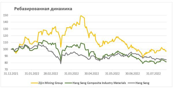 Акции Zijin Mining Group демонстрируют более уверенную динамику по сравнению с общим и отраслевым индексами и выглядят увереннее рынка благодаря динамике металлов и хорошим результатам. С начала года акции компании теряют в цене только 2,6%, в то время как индекс гонконгской биржи Hang Seng снизился на 15,5%, а отраслевой индекс Hang Seng Composite Industry Materials упал на 18,7%.