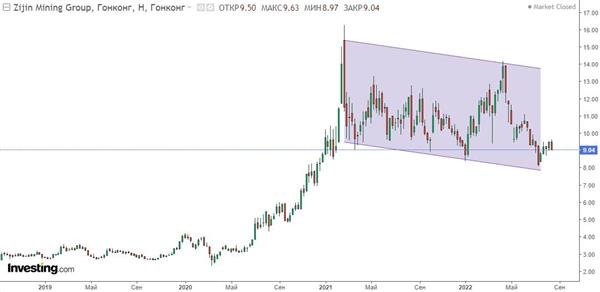На недельном графике котировки акций Zijin Mining Group после сильного роста консолидируются в широком диапазоне. Нижняя граница диапазона проходит выше 7,6 HKD, а верхняя - в районе 13,5 HKD.